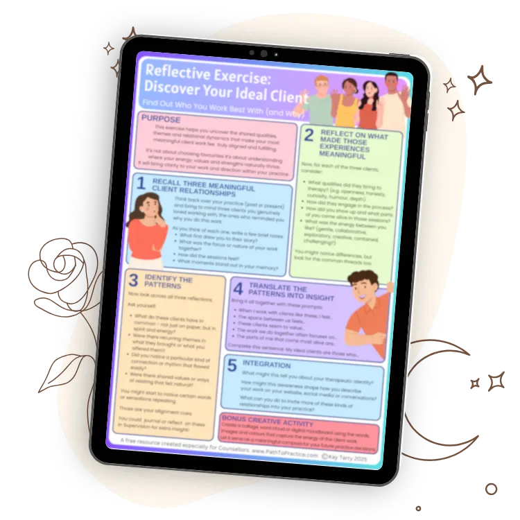 Counsellors who want to feel more aligned in their practice, attract clients who genuinely connect with their way of working, and rediscover the sessions that feel most alive and meaningful.